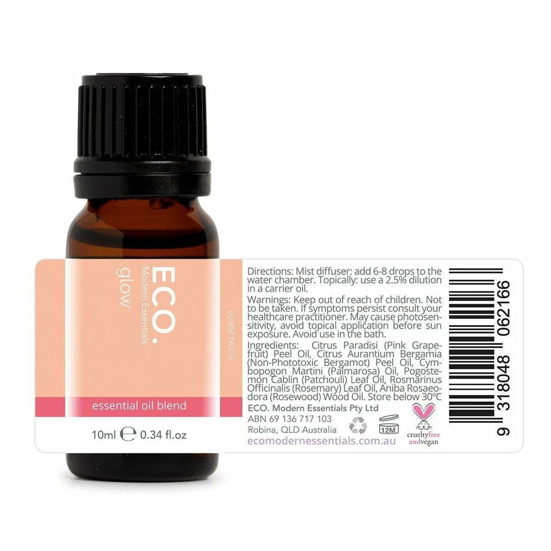 Glow Essential Oil Blend: Citrus paradisi (Pink Grapefruit) peel oil, Citrus aurantium bergamia (non-photoxic Bergamot) peel oil, Cymbopogon martini (Palmarosa) oil, Pogostemon cablin (Patchouli) leaf oil, Rosmarinus officinalis (Rosemary) leaf oil, Aniba rosaeodora (Rosewood) wood oil.