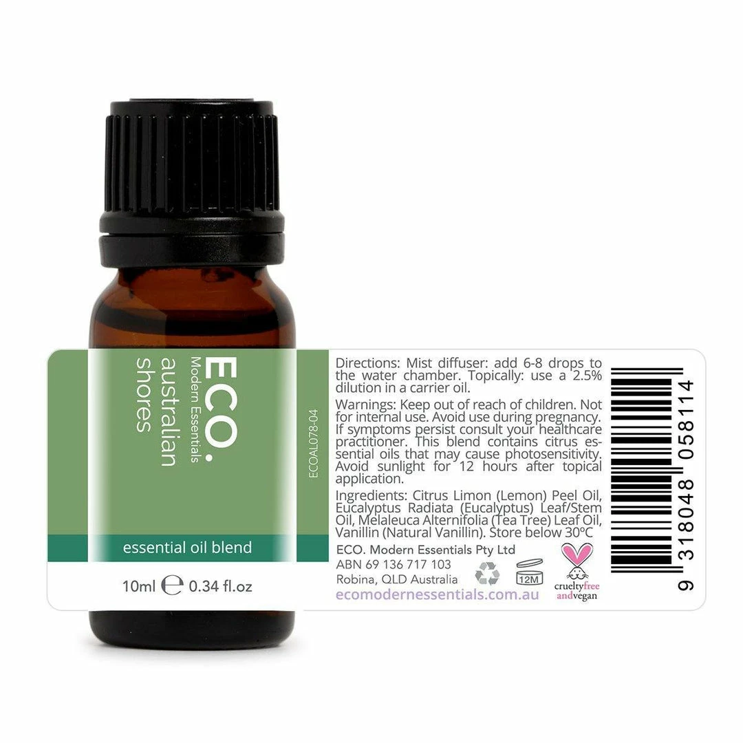 Australian Shores Essential Oil Blend: Citrus limon (Lemon) peel oil, Eucalyptus radiata (Eucalyptus) leaf/stem oil, Melaleuca alternifolia (Tea Tree) leaf oil, Vanillin (Natural Vanillin).