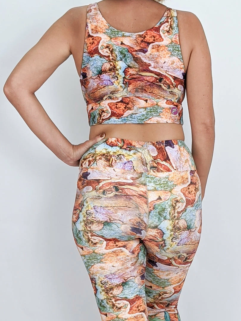This sassy Australian-style Camo design features the colourful bark of the Rainbow Eucalyptus tree, with lower leg detail of gum blossoms amidst a splash of fuschia xxoo