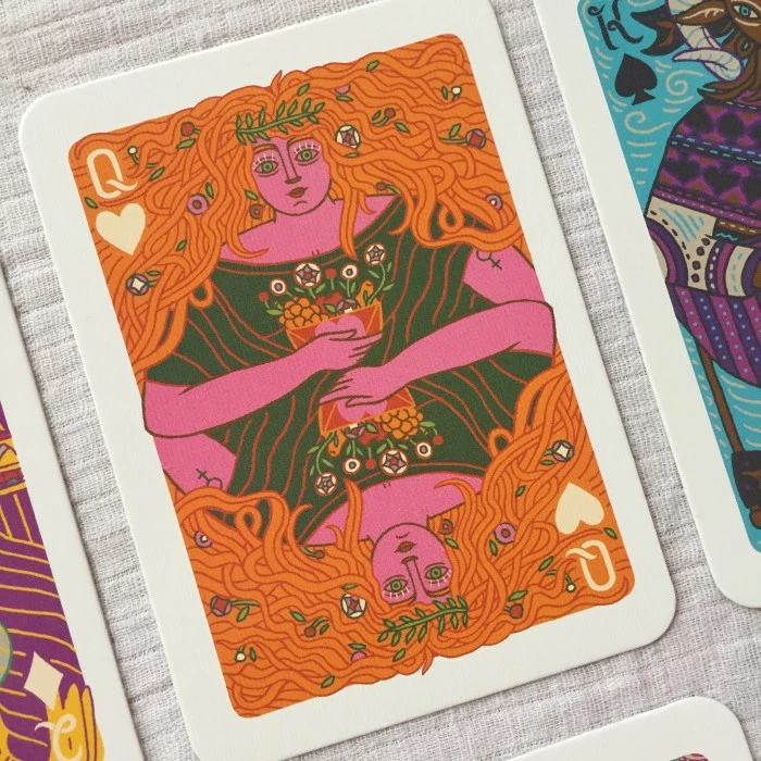 This deluxe box comes wrapped in colored paper with its cover art tipped in for a rustic, handmade feel. Every suit of cards in the deck features its own color scheme and a unique and evocative art for each card. Included in the package is a hand-drawn booklet that provides the meanings and usage behind each card in the deck.