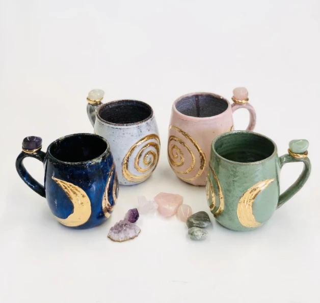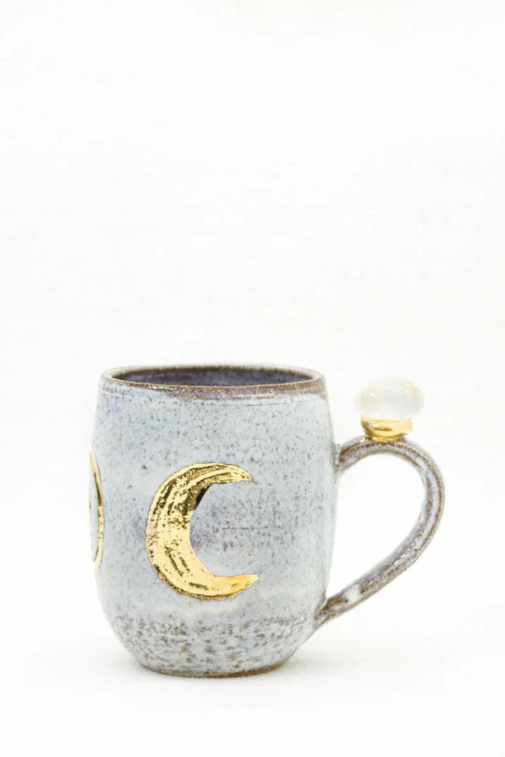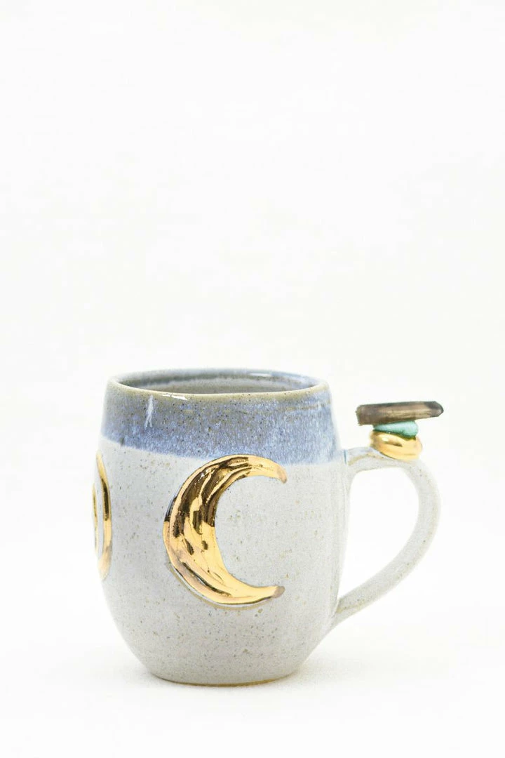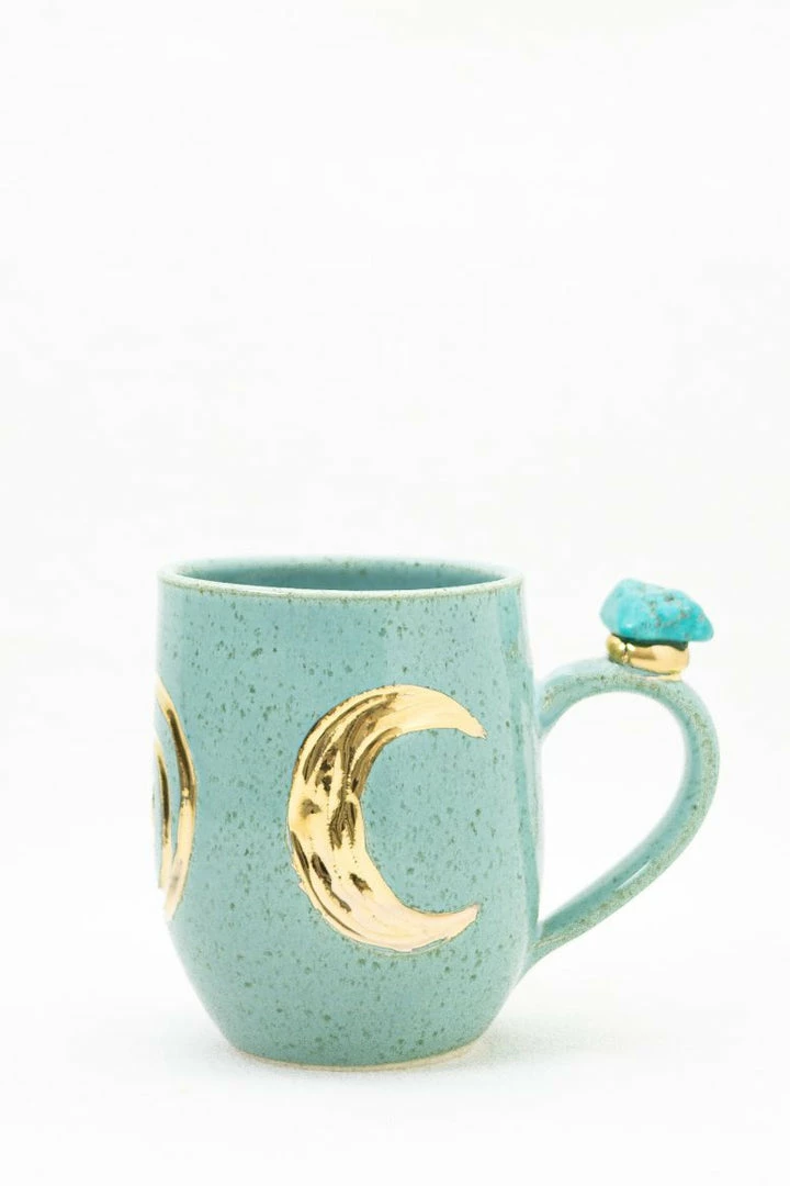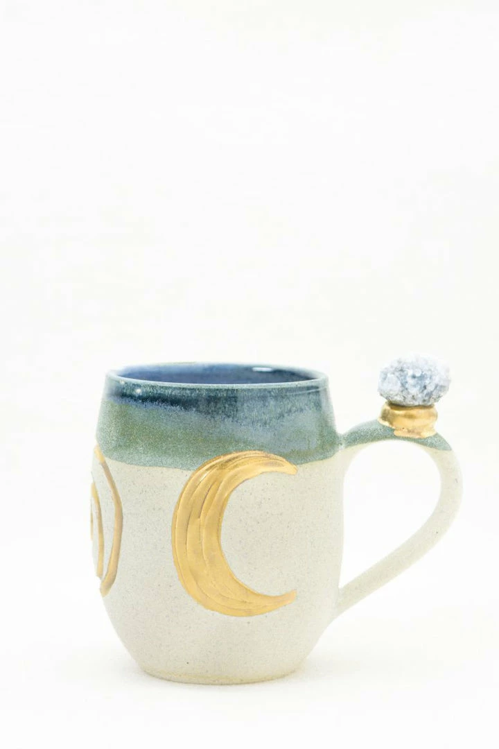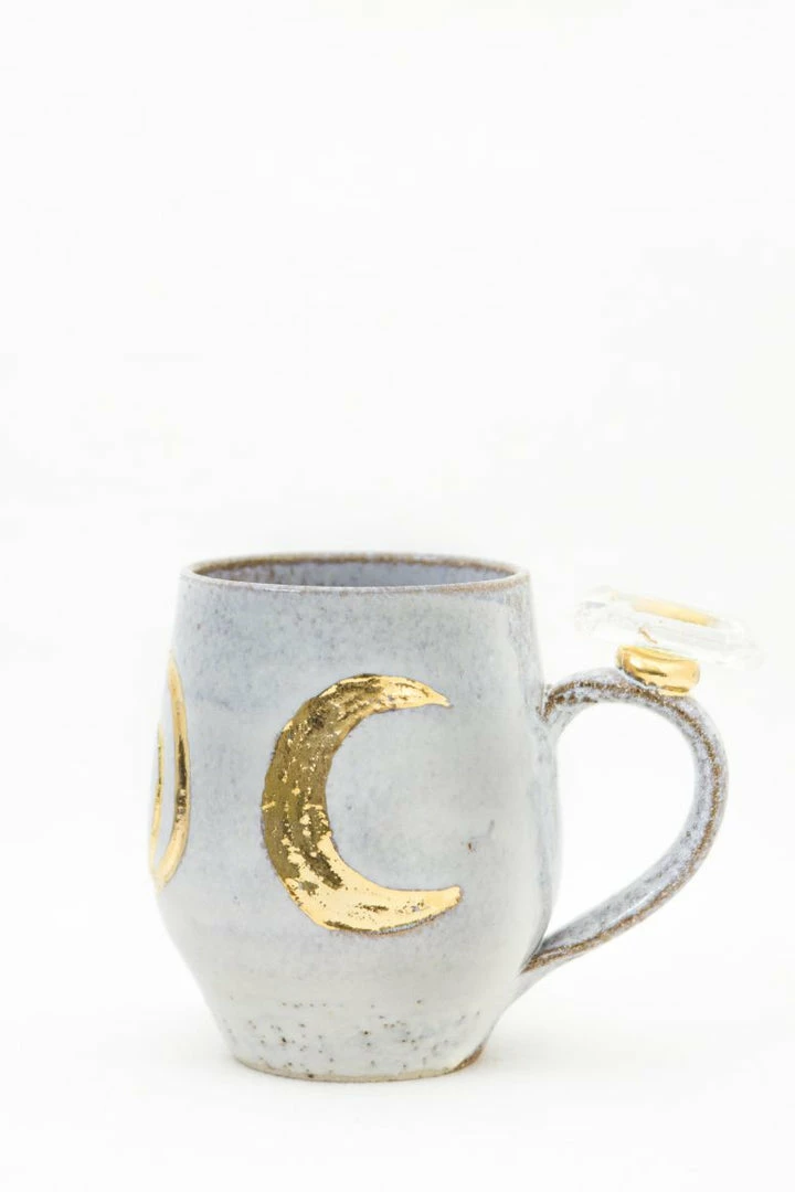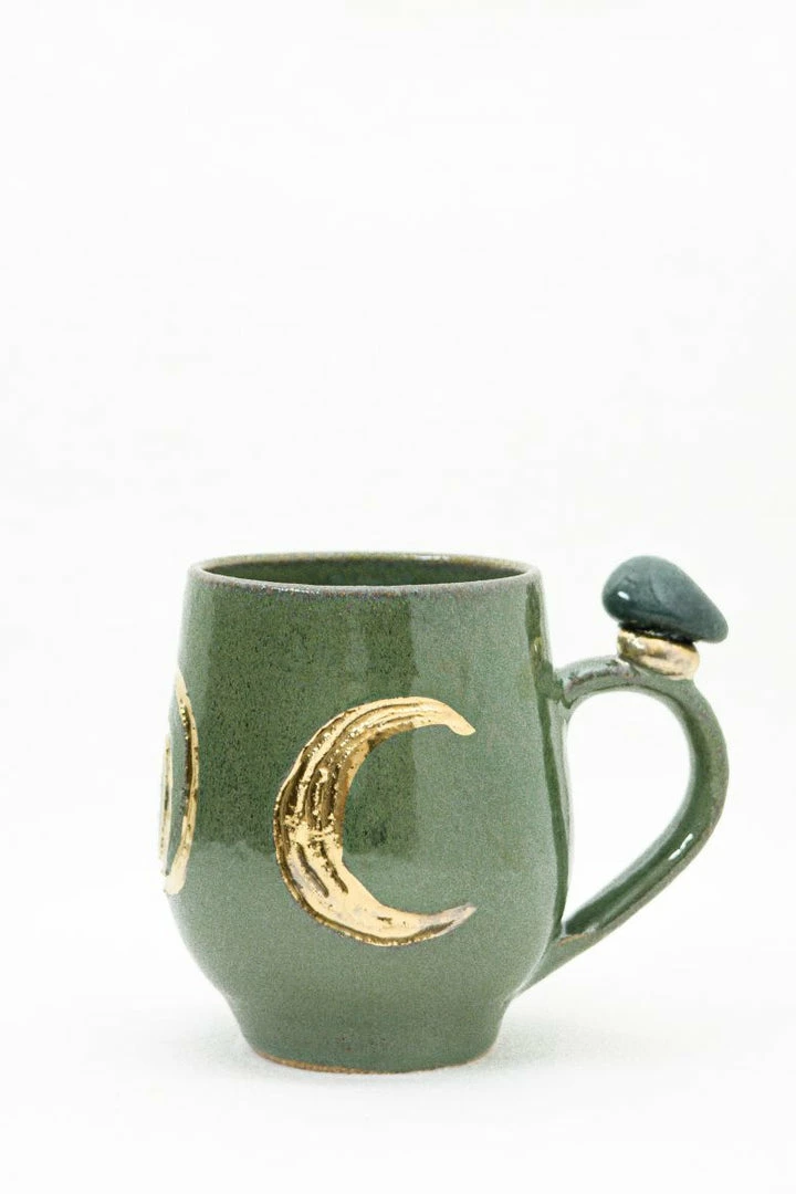 These beautiful wheel-thrown large mugs have the triple goddess carved into the clay. These mugs are hand-painted with liquid gold and each are decorated with a different crystal. The triple goddess is a connection to all things feminine. It’s comprised of a waxing crescent, full moon, and a waning crescent. The symbol is the maiden, mother, and crone. Each phase of the moon correlates with a phase of a woman’s life.