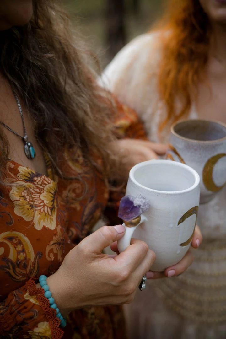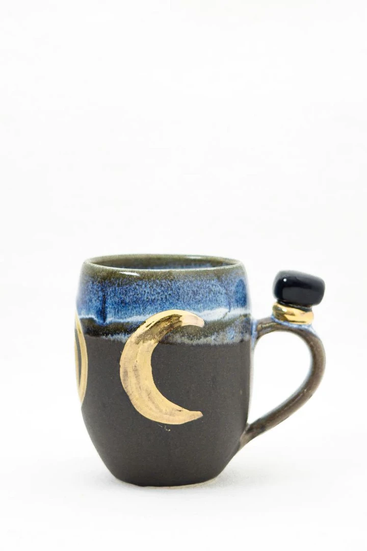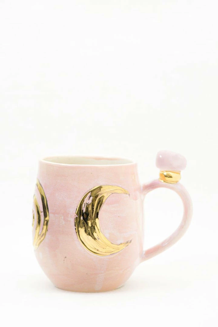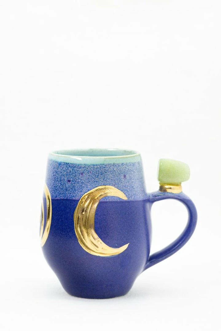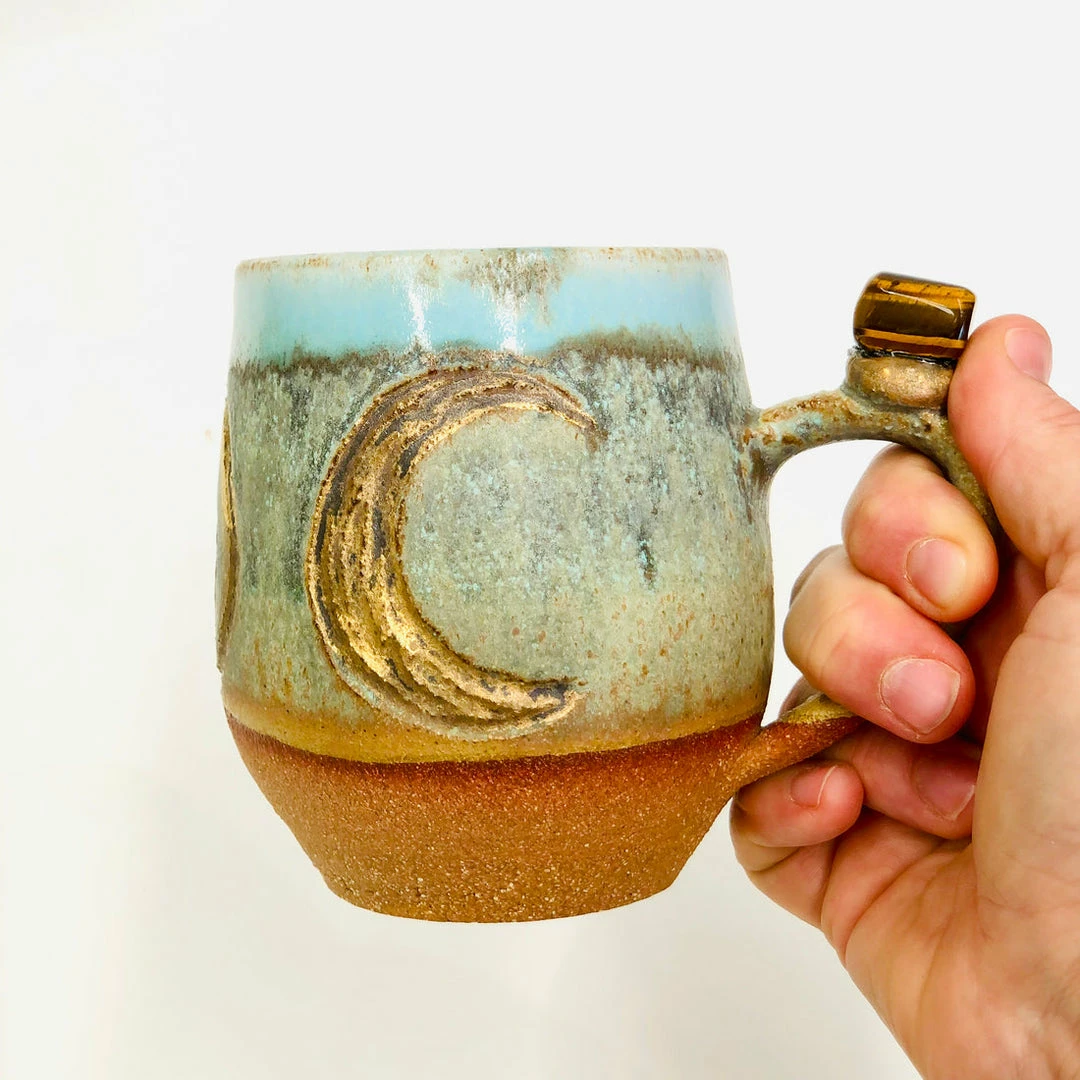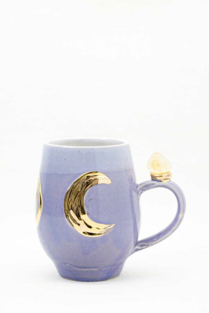 These beautiful wheel-thrown large mugs have the triple goddess carved into the clay. These mugs are hand-painted with liquid gold and each are decorated with a different crystal. The triple goddess is a connection to all things feminine. It’s comprised of a waxing crescent, full moon, and a waning crescent. The symbol is the maiden, mother, and crone. Each phase of the moon correlates with a phase of a woman’s life.