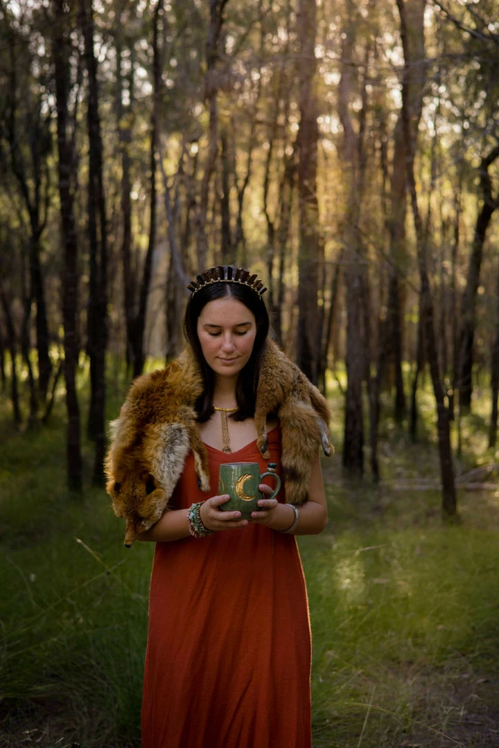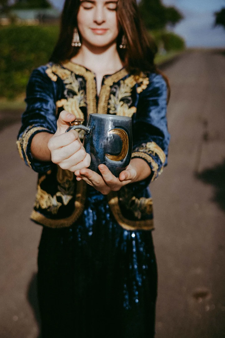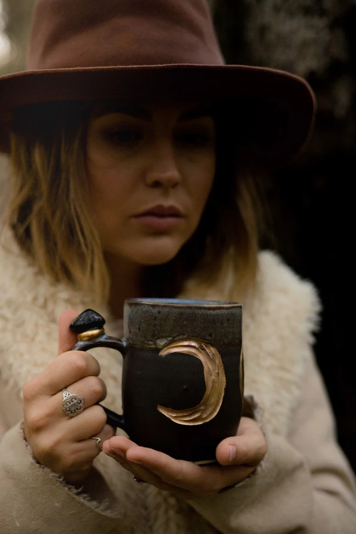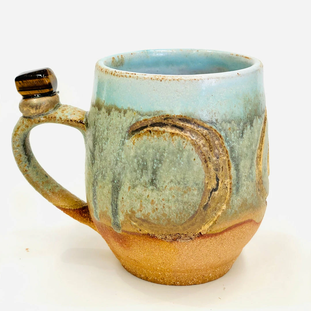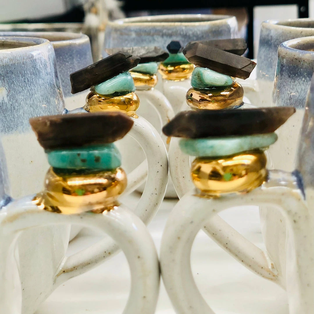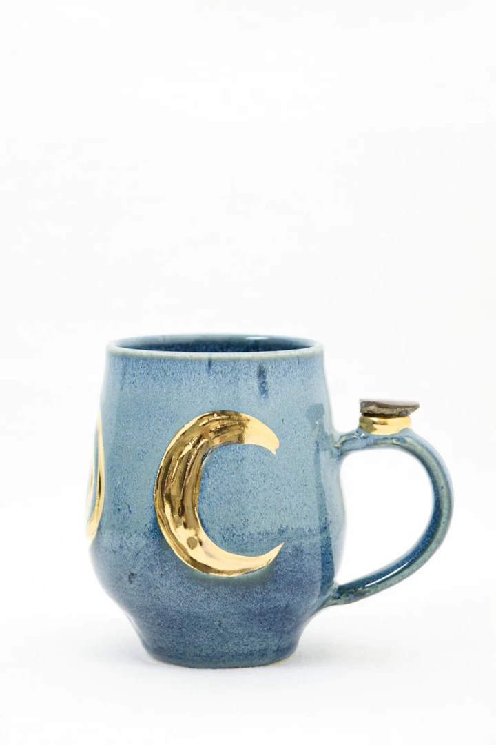 These beautiful wheel-thrown large mugs have the triple goddess carved into the clay. These mugs are hand-painted with liquid gold and each are decorated with a different crystal. The triple goddess is a connection to all things feminine. It’s comprised of a waxing crescent, full moon, and a waning crescent. The symbol is the maiden, mother, and crone. Each phase of the moon correlates with a phase of a woman’s life.