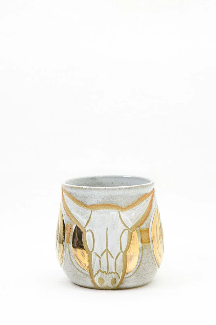 Stoneware beaker with beautiful glaze and liquid gold detail.