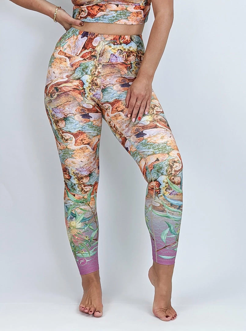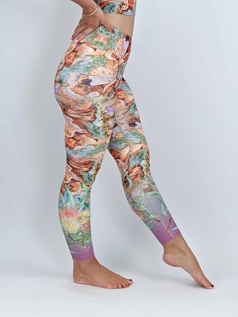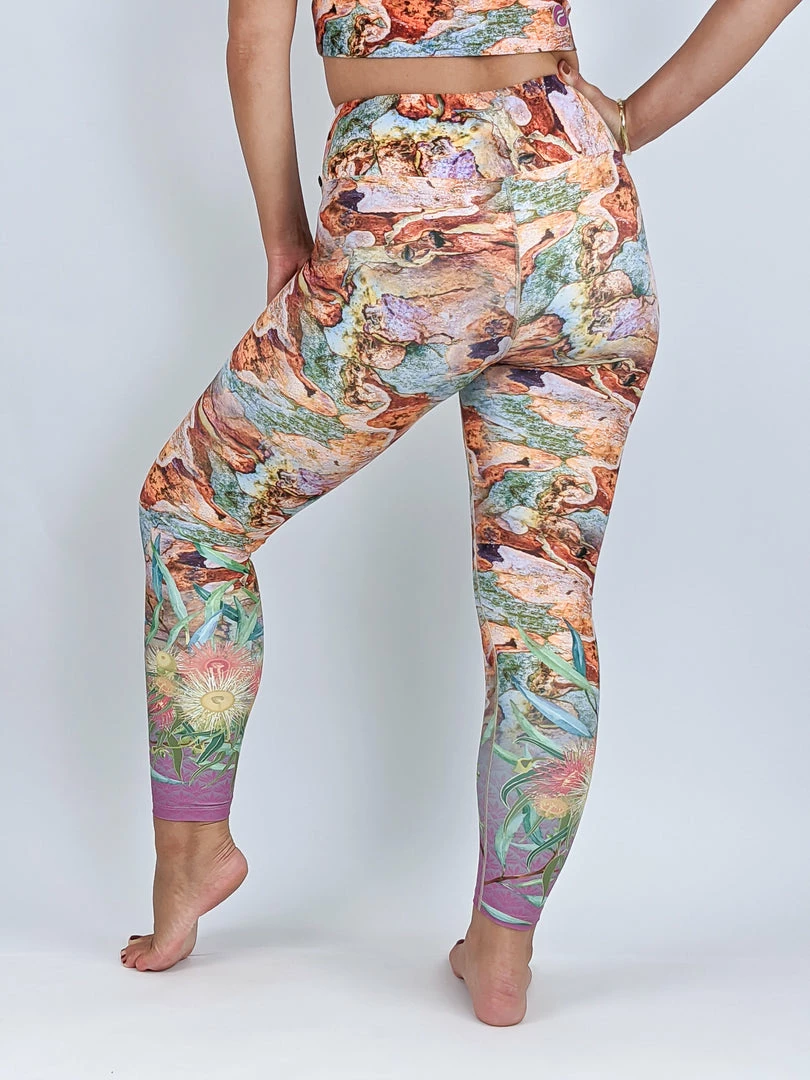 This sassy Australian-style Camo design features the colourful bark of the Rainbow Eucalyptus tree, with lower leg detail of gum blossoms amidst a splash of fuschia xxoo