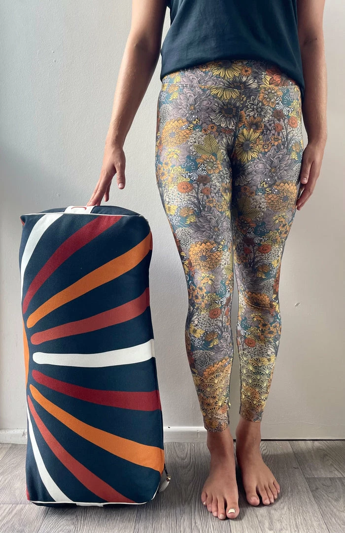 Meet our very special yoga bolster – designed, printed, cut and manufactured in Australia using luxurious recycled poly upholstery fabric for the case and stuffed with filling made from recycled plastic bottles!