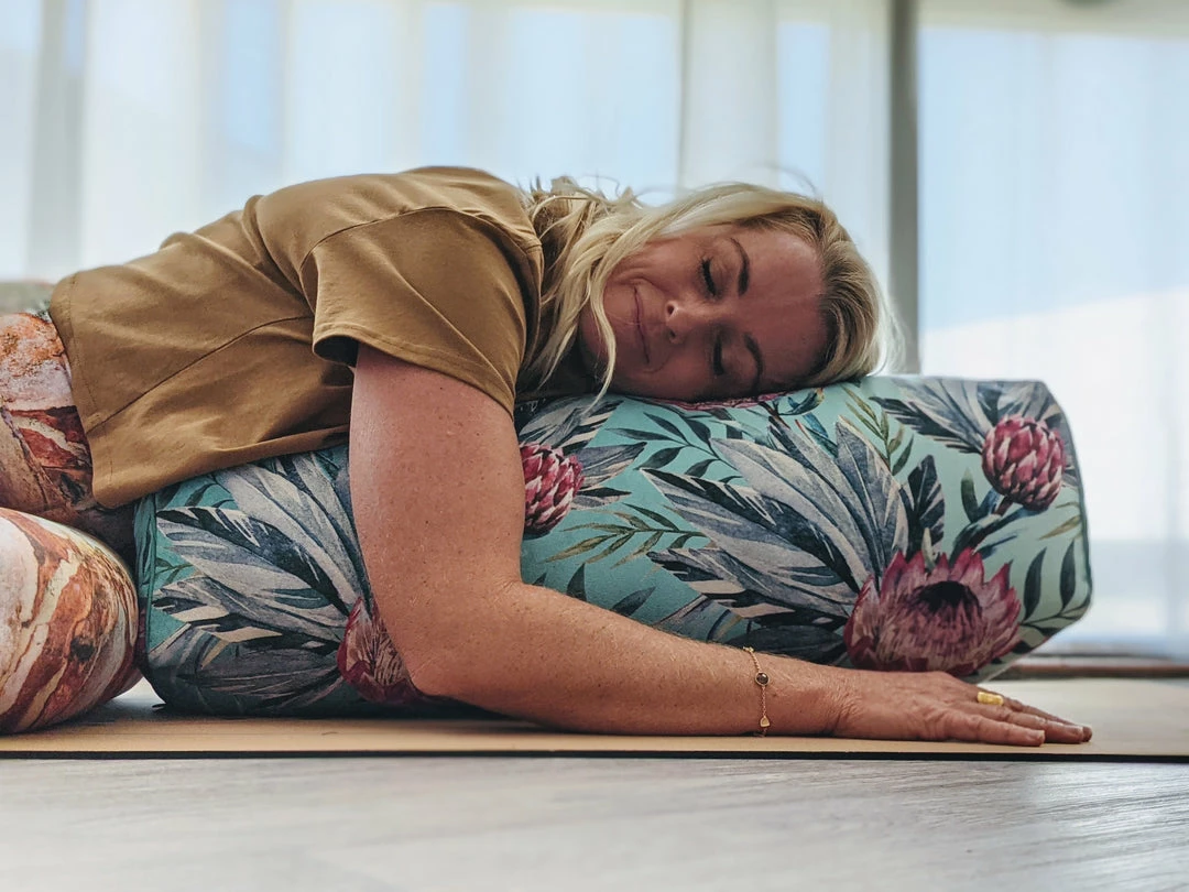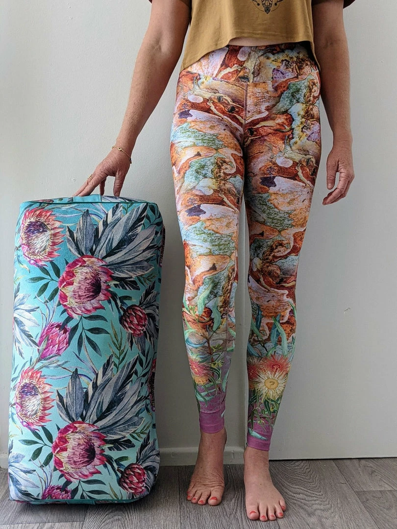 Meet our very special yoga bolster – designed, printed, cut and manufactured in Australia using luxurious recycled poly upholstery fabric for the case and stuffed with filling made from recycled plastic bottles!
