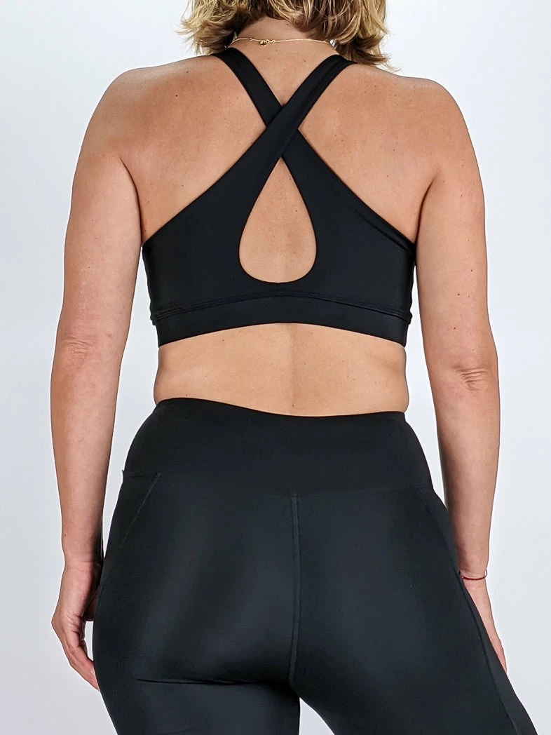 After almost 6 years of vibrant prints, Flow is now showing her shadow self to the world. Our Midnight Black keyhole croptop features a lovely keyhole back and comfy seam-free straps. Made from our new midnight black recycled polyester.