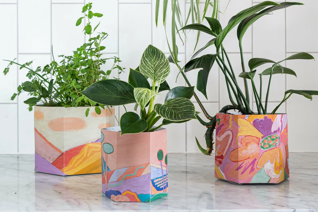 Featuring beautiful hand-painted abstract artworks by Jackie Anderson, these origami style pots come flat which makes them an affordable gift to send in the mail, and once received, they simply assemble with a quick pop and a push.