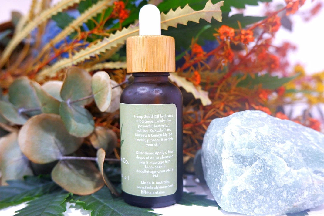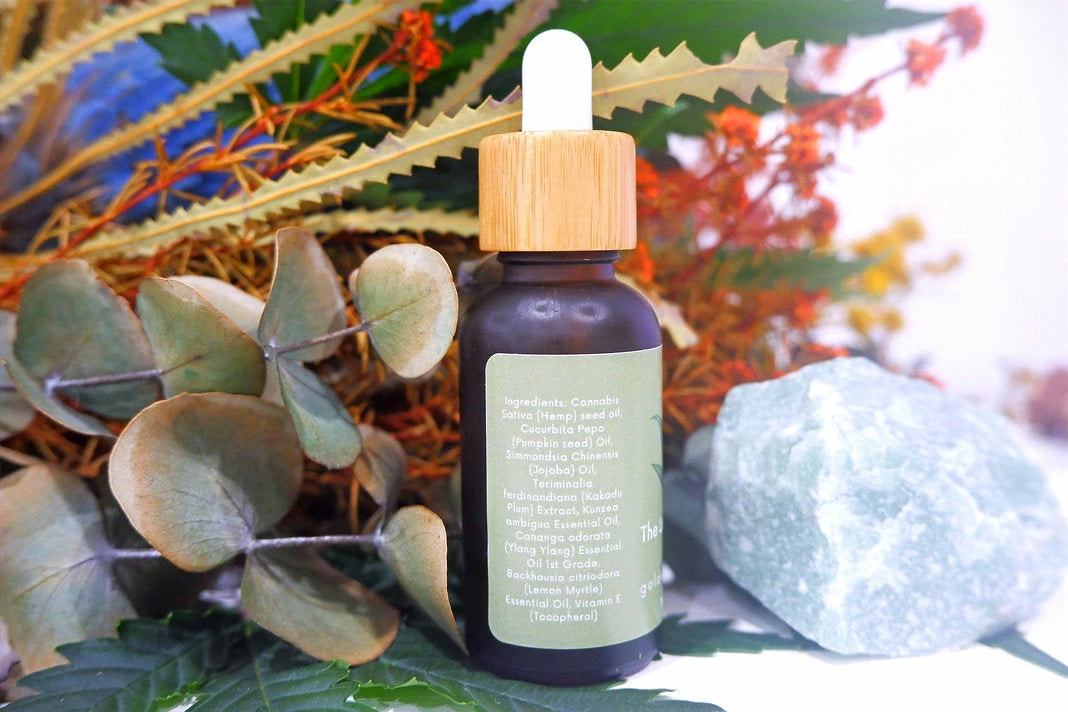Ingredients: Cannabis Sativa (Hemp) seed oil, Cucurbita Pepo (Pumpkin seed) Oil, Simmondsia Chinensis (Jojoba) Oil, Teriminalia ferdinandiana (Kakadu Plum) Extract, Kunzea ambigua (Kunzea) Essential Oil, Cananga odorata (Ylang Ylang) Essential Oil 1st Grade, Backhousia citriodora (Lemon Myrtle) Essential Oil, Vitamin E (Tocopherol)