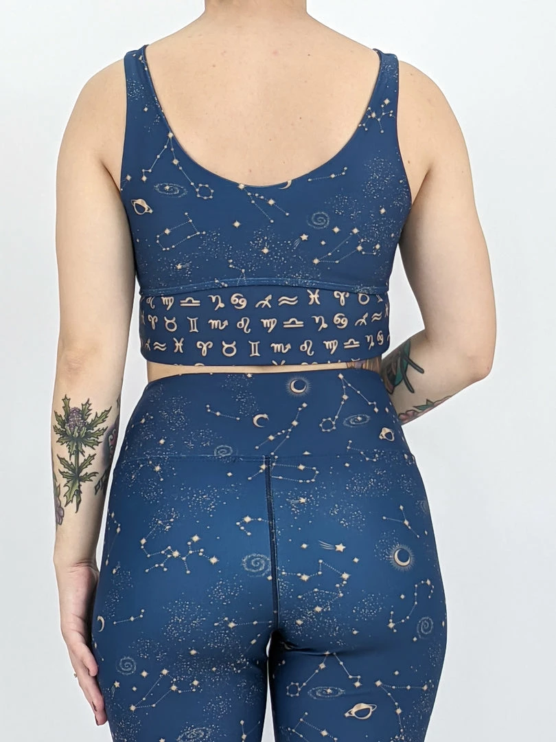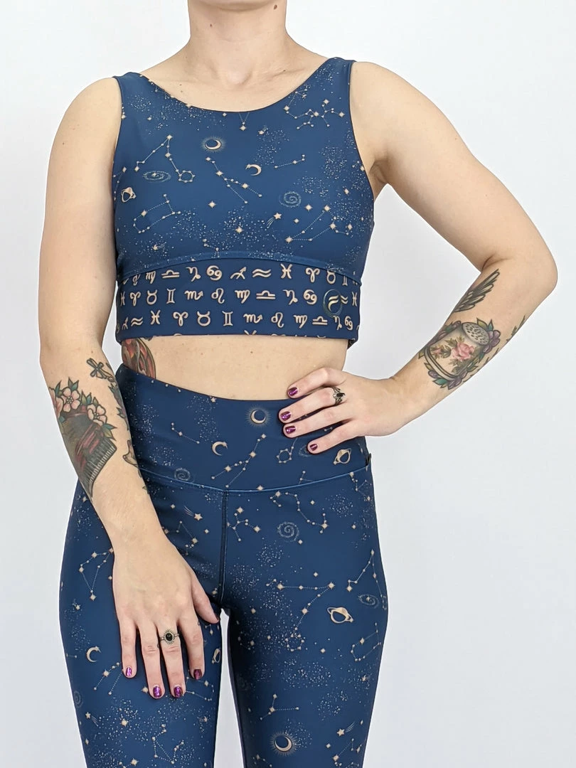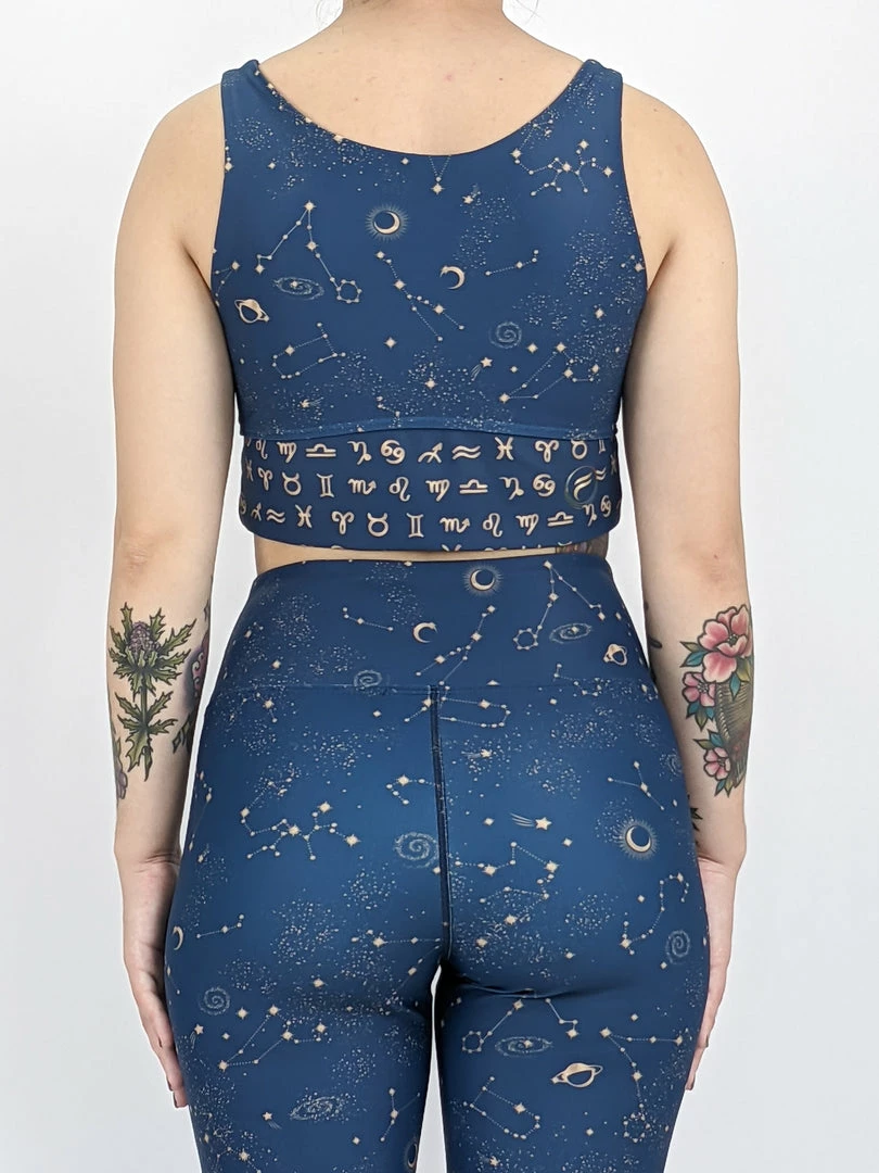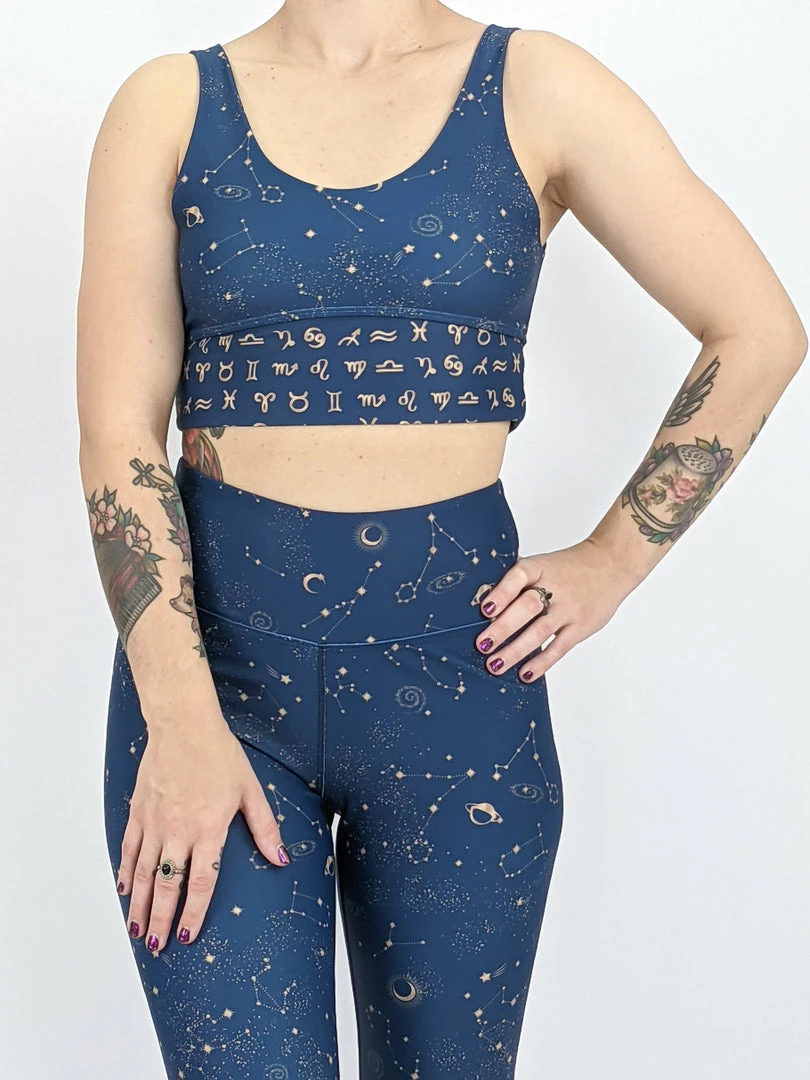Our gorgeous Stellar design features little gold coloured stars, moons and constellations against a background of soft denim blue with horoscope symbols twisting around the lower leg. We adore this print and hope you will too! xxoo