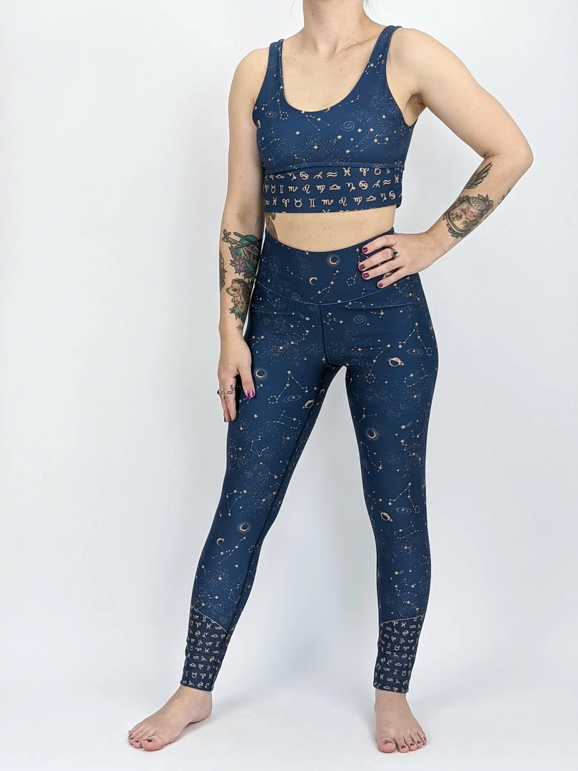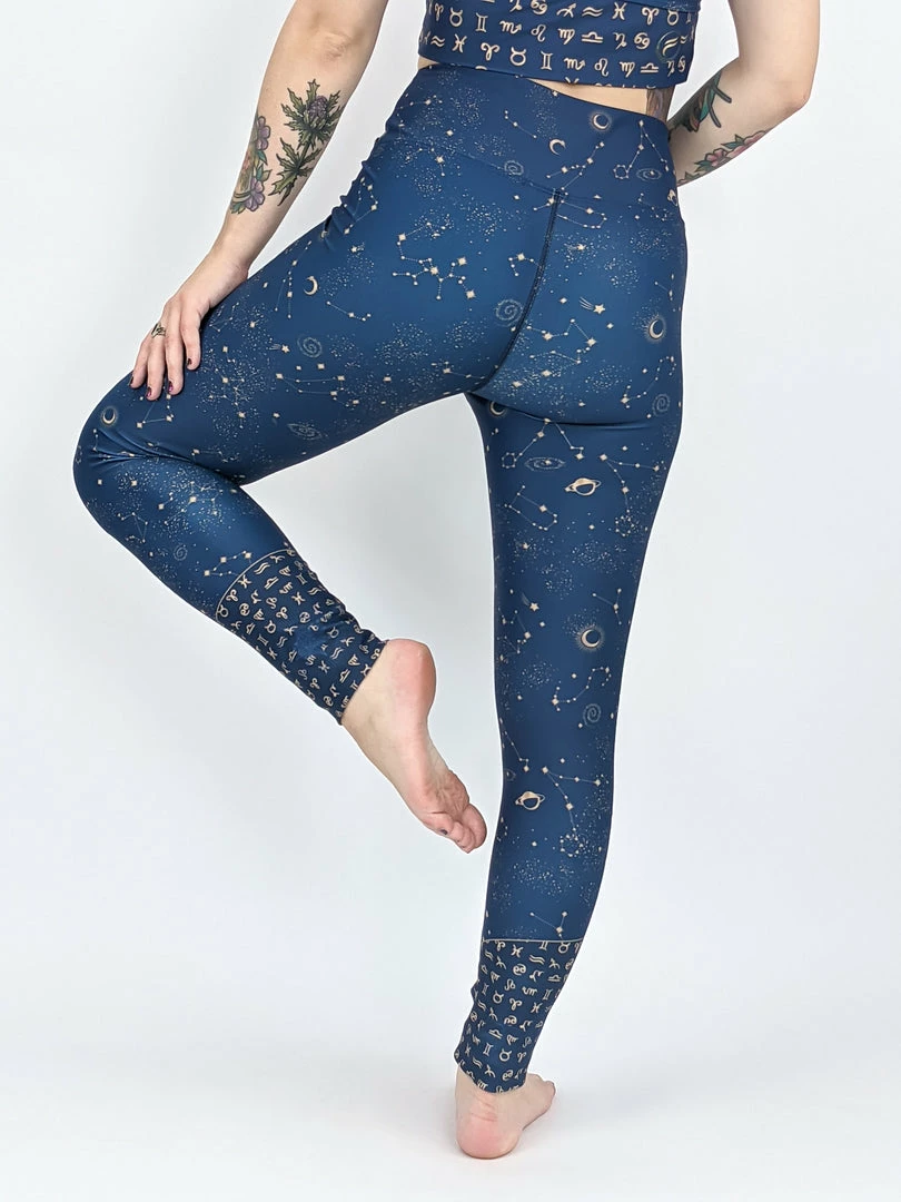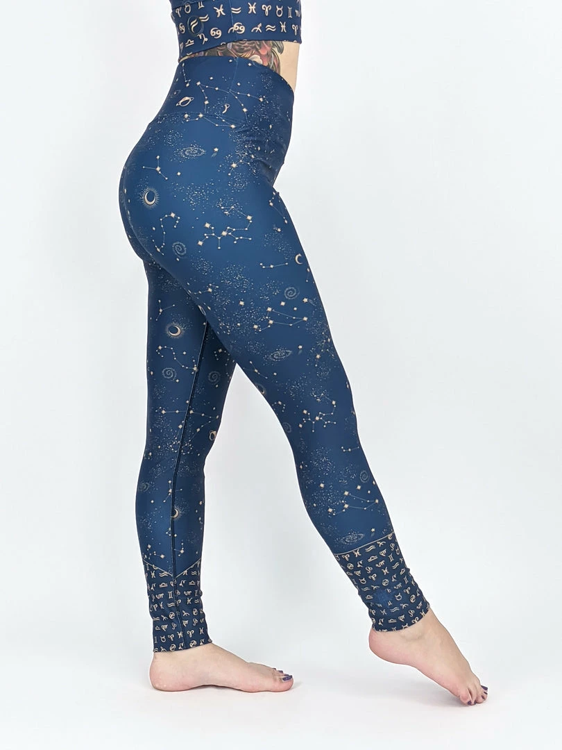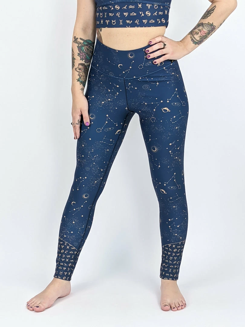 Our gorgeous Stellar design features little gold coloured stars, moons and constellations against a background of soft denim blue with horoscope symbols twisting around the lower leg. We adore this print and hope you will too! xxoo
