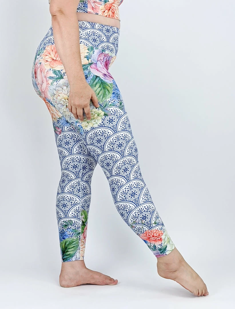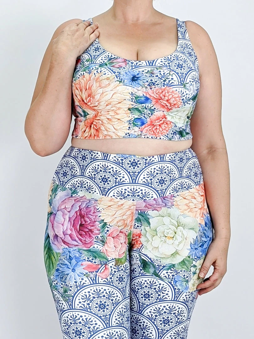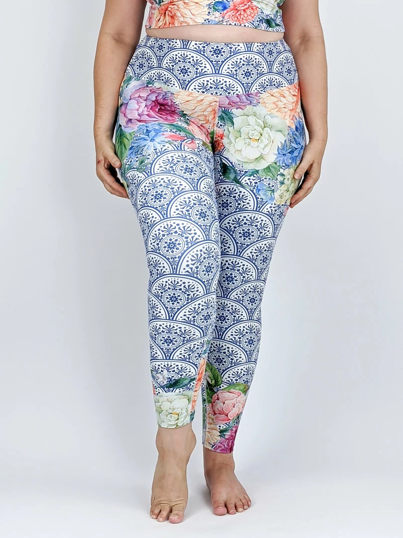 This lovely design features a blue and white porcelain motif overlaid with bright peony flowers. Pair with a crisp white tee or pastel toned top for a complete look xxoo