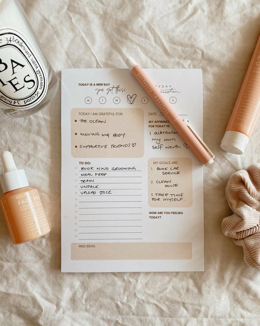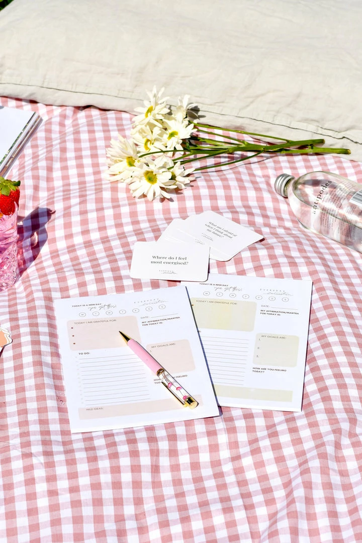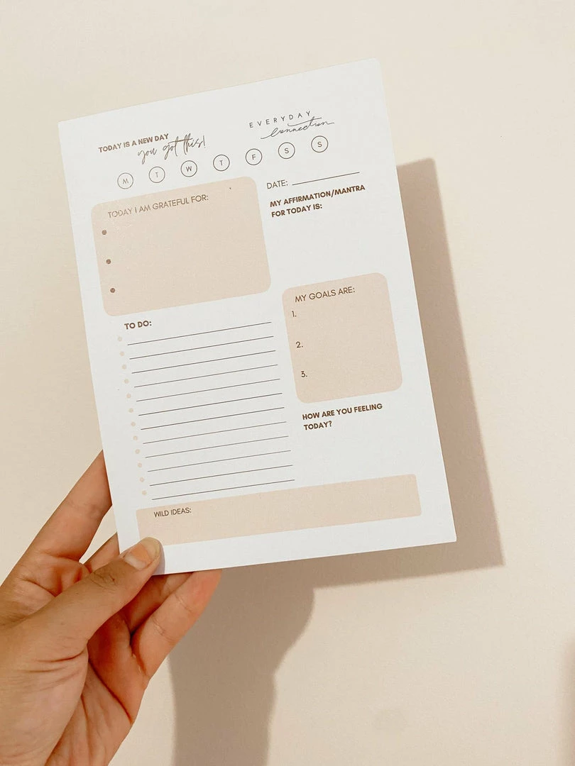 This notepad features space for your daily gratitude, daily affirmation or mantra, goals, to-do list, a small space for reflecting on your feelings and space for your wild ideas or notes! You got this!!Β